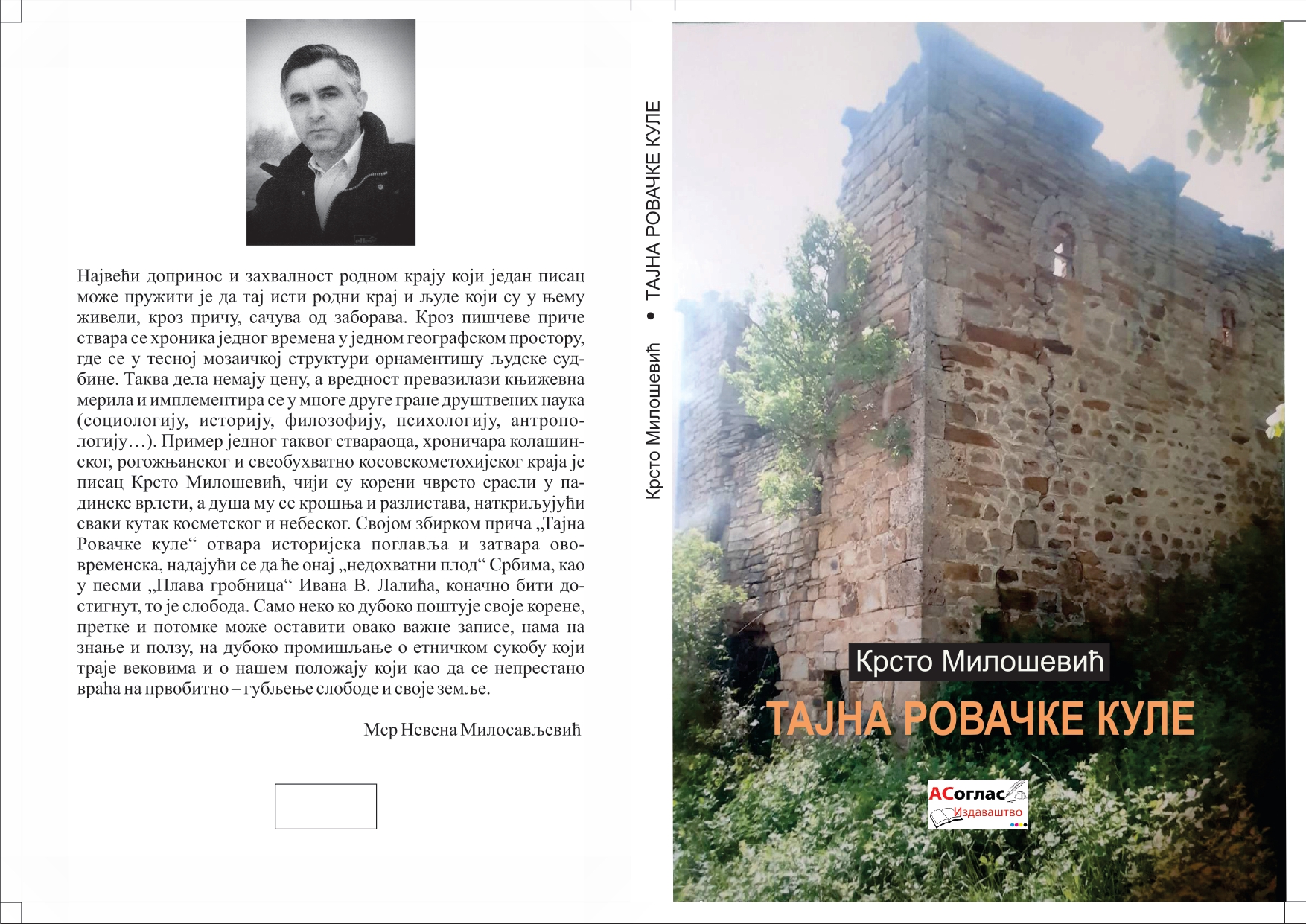 Највећи допринос и захвалност родном крају који један писац може пружити је да тај исти родни крај и људе који су у њему живели, кроз причу, сачува од заборава. Кроз пишчеве приче ствара се хроника једног времена у једном географском простору, где се у тесној мозаичкој структури орнаментишу људске судбине. Таква дела немају цену, а вредност превазилази књижевна мерила и имплементира се у многе друге гране друштвених наука (социологију, историју, филозофију, психологију, антропологију…). Пример једног таквог ствараоца, хроничара колашинског, рогожњанског и свеобухватно косовскометохијског краја је писац Крсто Милошевић, чији су корени чврсто срасли у падинске врлети, а душа му се крошња и разлистава, наткриљујући сваки кутак косметског и небеског. Својом збирком прича ,,Тајна Ровачке куле” отвара историјска поглавља и затвара ововременска, надајући се да ће онај ,,недохватни плод” Србима, као у песми ,,Плава гробница” Ивана В. Лалића, коначно бити достигнут, то је слобода. Само неко ко дубоко поштује своје корене, претке и потомке може оставити овако важне записе, нама на знање и ползу, на дубоко промишљање о етничком сукобу који траје вековима и о нашем положају који као да се непрестано враћа на првобитно – на губљење слободе и своје земље.