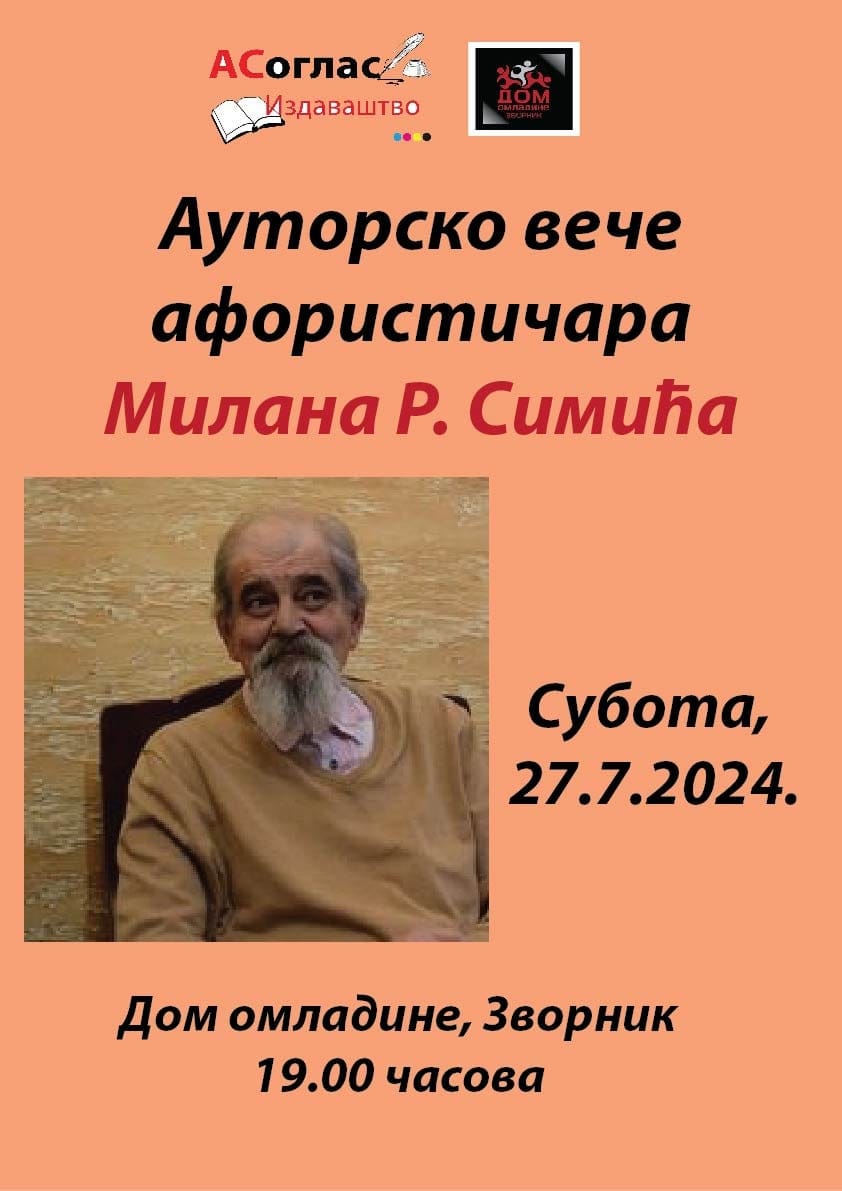 ASoglas Izdavaštvo Promocije Ауторско вече афористичара Милана Р. Симића PromocijeVijesti Ауторско вече афористичара Милана Р. Симића Autor Dejan Spasojević - July 23, 2024 135 0 FacebookTwitterPinterestWhatsAppTelegram Зворник, субота 27.7.2024.године у Дому омладине са почетком од 19,00 часова.