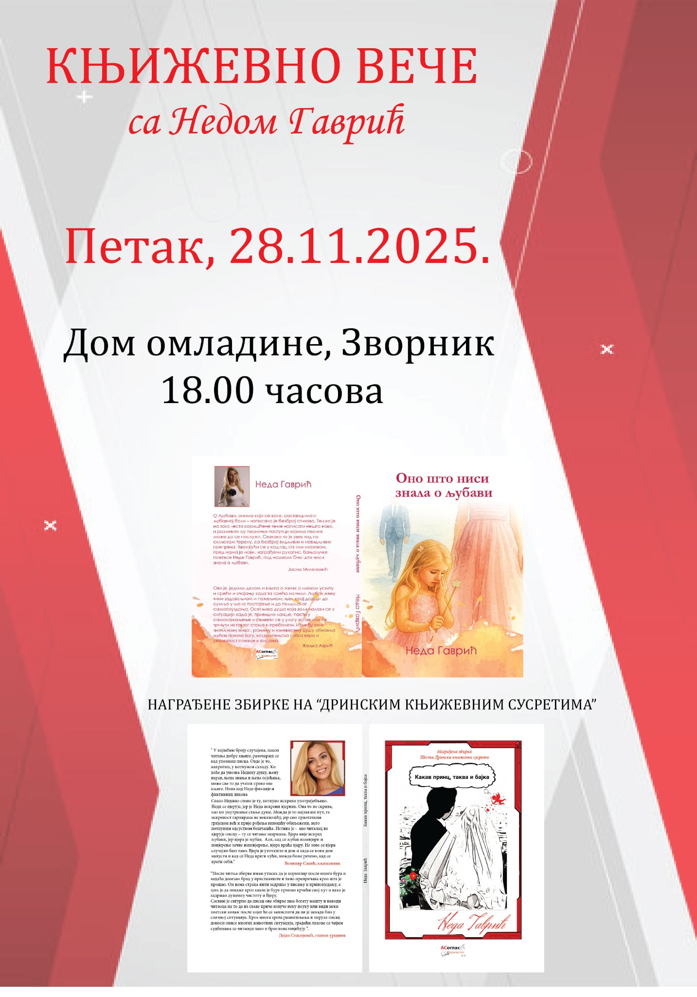 ASoglas Izdavaštvo Promocije Књижевно вече Неде Гаврић PromocijeVijesti Књижевно вече Неде Гаврић Autor Dejan Spasojević - November 24, 2025 41 0 FacebookTwitterPinterestWhatsAppTelegram Зворник, Дом омладине, петак 28.11.2025.године, са почетком у 18,00 часова. Учесници:Наташа Лазукић,Дејан Спасојевић, Неда Гаврић