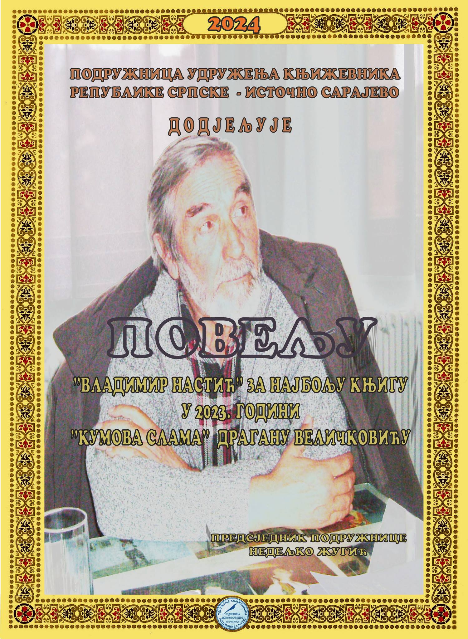 НАГРАДА ‘’ВЛАДИМИР НАСТИЋ’’ ЗА НАЈБОЉУ ОБЈАВЉЕНУ КЊИГУ ПОЕЗИЈЕ У 2023. ГОДИНИ ДОДИЈЕЛИЋЕ СЕ ДРАГАНУ ВЕЛИЧКОВИЋУ ЗА КЊИГУ ПЈЕСАМА ‘’КУМОВА СЛАМА’’.