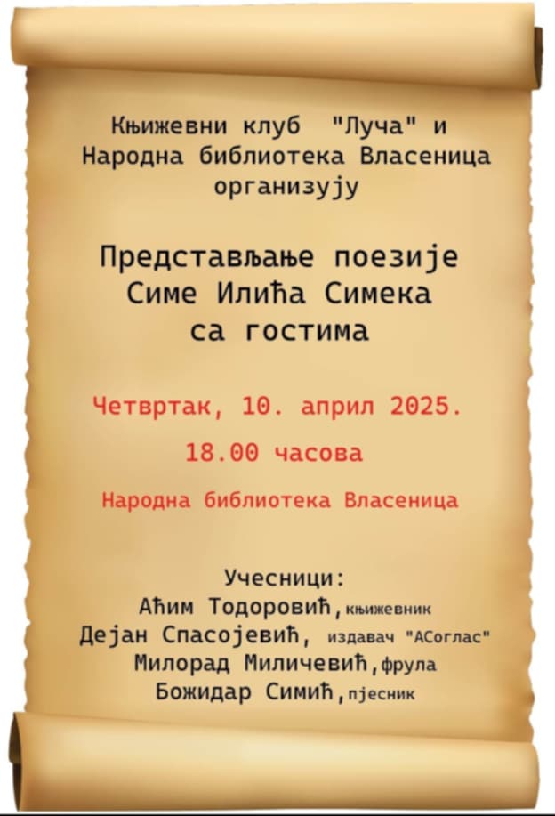 Књижевни клуб ”Луча” и Народна библиотека Власеница организују ПРЕДСТАВЉАЊЕ ПОЕЗИЈЕ СИМЕ ИЛИЋА СИМЕКА са гостима.