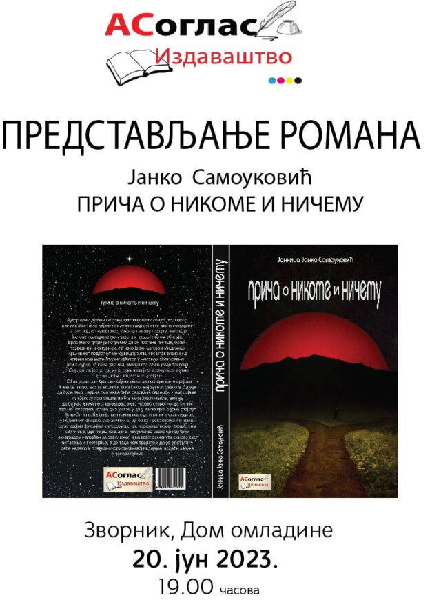 ASoglas Izdavaštvo Promocije Представљање романа ” ПРИЧА О НИКОМЕ И НИЧЕМУ ” Јанка Самоуковића PromocijeVijesti Представљање романа ” ПРИЧА О НИКОМЕ И НИЧЕМУ ” Јанка Самоуковића Autor Dejan Spasojević - June 15, 2023 122 0 FacebookTwitterPinterestWhatsAppTelegram Представљање романа ” ПРИЧА О НИКОМЕ И НИЧЕМУ ” Јанка Самоуковића одржаће се у Зворнику 20.јуна са почетком у 19,00 часова у малој сали Дома омладине.