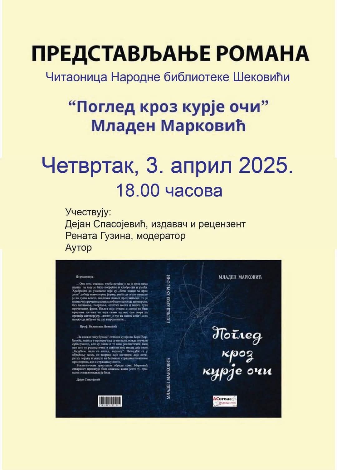 ASoglas Izdavaštvo Promocije Предтсављање романа ”ПОГЛЕД КРОЗ КУРИЈЕ ОЧИ” у Шековићима Promocije Предтсављање романа ”ПОГЛЕД КРОЗ КУРИЈЕ ОЧИ” у Шековићима Autor Dejan Spasojević - April 3, 2025 221 0 FacebookTwitterPinterestWhatsAppTelegram Учествују : Дејан Спасојевић, Младен Марковић Рената Гузина, модератор
