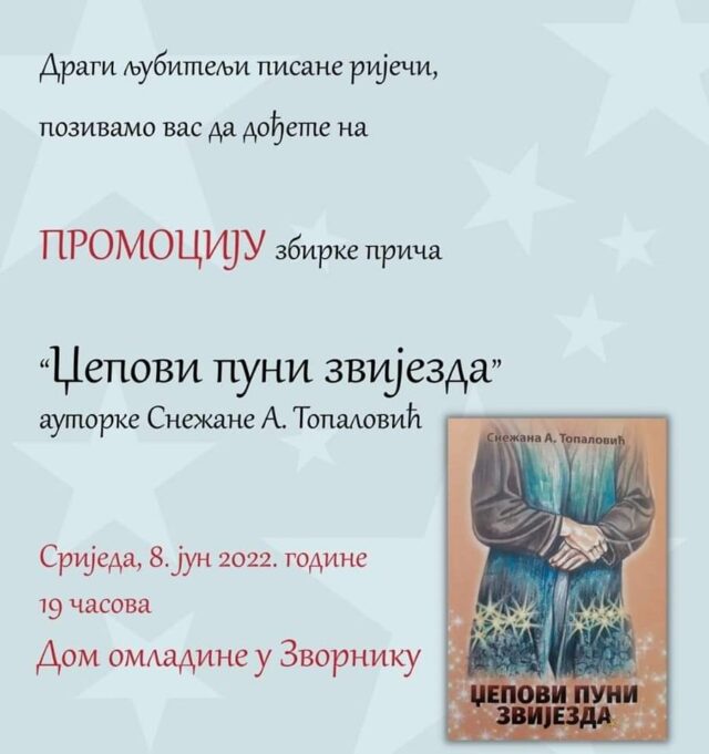 ASoglas Izdavaštvo Promocije Promocija nagrađene zbirke priča ”Džepovi puni zvijezda” , aturoke Snežane A. Topalović Promocije Promocija nagrađene zbirke priča ”Džepovi puni zvijezda” , aturoke Snežane A. Topalović Autor Dejan Spasojević - June 8, 2022 94 0 FacebookTwitterPinterestWhatsAppTelegram