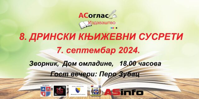 Одржавање манифестације 8. Дрински књижевни сусрети планирано је за 7.септембар 2024.године од 18 часова у Зворнику у великој сали дома омладине.Гост вечери биће чувени пјесник Перо Зубац.