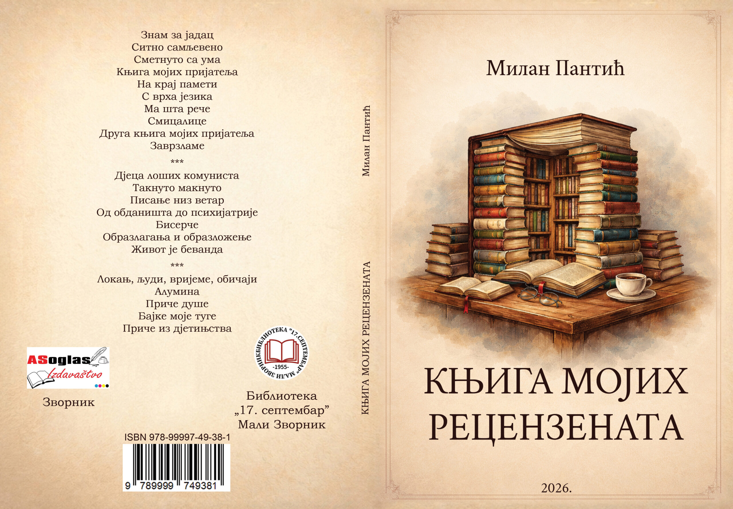 ASoglas Izdavaštvo Izdanja У припреми ”Књига мојих рецензената” Милана Пантића IzdanjaVijesti У припреми ”Књига мојих рецензената” Милана Пантића Autor Dejan Spasojević - April 17, 2026 6 0 FacebookTwitterPinterestWhatsAppTelegram