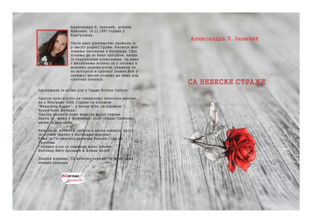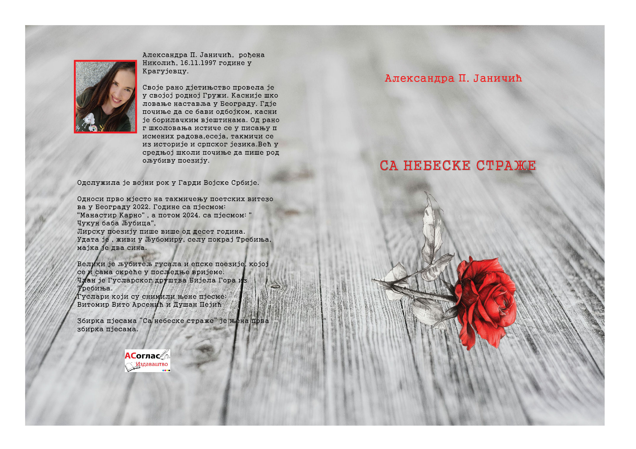 Када би се анђеоски језик могао описати, засигурно би био најприближнији поезији. Стиховање и песништво је област која је тако квалитетно и широко заступљена у српском народу и читавом српском бићу. Нико више и лепше не стихује него Срби, нити се тако дивно и топло у стиховима изражава. Управо таква је и поезија Александре Јаничић, дивна и топла. Не може ни бити другачија ако знамо да је ауторка ове збирке рођена у чаробном гружанском крајолику, колевци шумадијског песништва коју је широм света прославио бесмртни песник Добрица Ерић, певајући о зрењу жита, плесу свитаца и мирису шумадијског хлеба. Са друге стране, Александра је свој живот наставила у поносној Херцеговини, па је ова компилација њених животних простора учинила њено стваралаштво изузетним. Њене песме су гружански топле, обојене у пролеће, цветање и најлепше обичаје којима се Срби поносе, али и херцеговачки родољубиве, пуне животне мудрости и жеље за очувањем традиције. Ауторка пева о свим ранама српског рода, осврћући се на њих са тугом, али и са поносом. Подједнако је боле сва страдања српскога народа, и изванредно вешто и опомињуће их оживљава својим пером, не дајући да се забораве. Са посебним пијететом и емоцијом се осврће на страдалништво српских ратника, издижући их на заслужени пиједестал, посебно се осврћући на српске Спартанце модерног времена, неумрле Солунце.