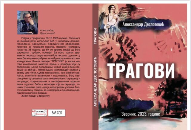 Александар Деспотовић, познат у Зворнику као Ацо Црногорац; зашто Црногорац, мени није познато, али ми је врло знано то име из тешких дана Отаџбинског рата, када смо делили ратне дане бранећи своју родну груду и свој српски народ, трасирајући му пут у слободу и миран живот на свом огњишту. Знам да је наш Ацо Црногорац родом из Пријепоља, можда се то учинило неким, који недовољно познају географију, да је Пријепоље, родно место Аце Црногорца, у Црној Гори, и да јесте не би сметало, јер су све то старе српске земље. Ако говоримо о ауторовом делу, а истовремено не говоримо и о аутору приказ његовог дела остаће недоречен и непотпун. Вероватно је мали број оних који су очекивали да ће Ацо да се огласи са својим песмама, бар сам ја међу њима, иако сам мислио да га добро познајем. Красило је чојство и јунаштво нашег Црногорца у свакој љутој бици током рата. Увек је на лицу и у најтежим тренутцима показивао благе црте ведрине и изразе душевне топлине. Те су његове особине управо добиле пун израз у његовој збирци песама која је пред нама, под именом ТРАГОВИ.