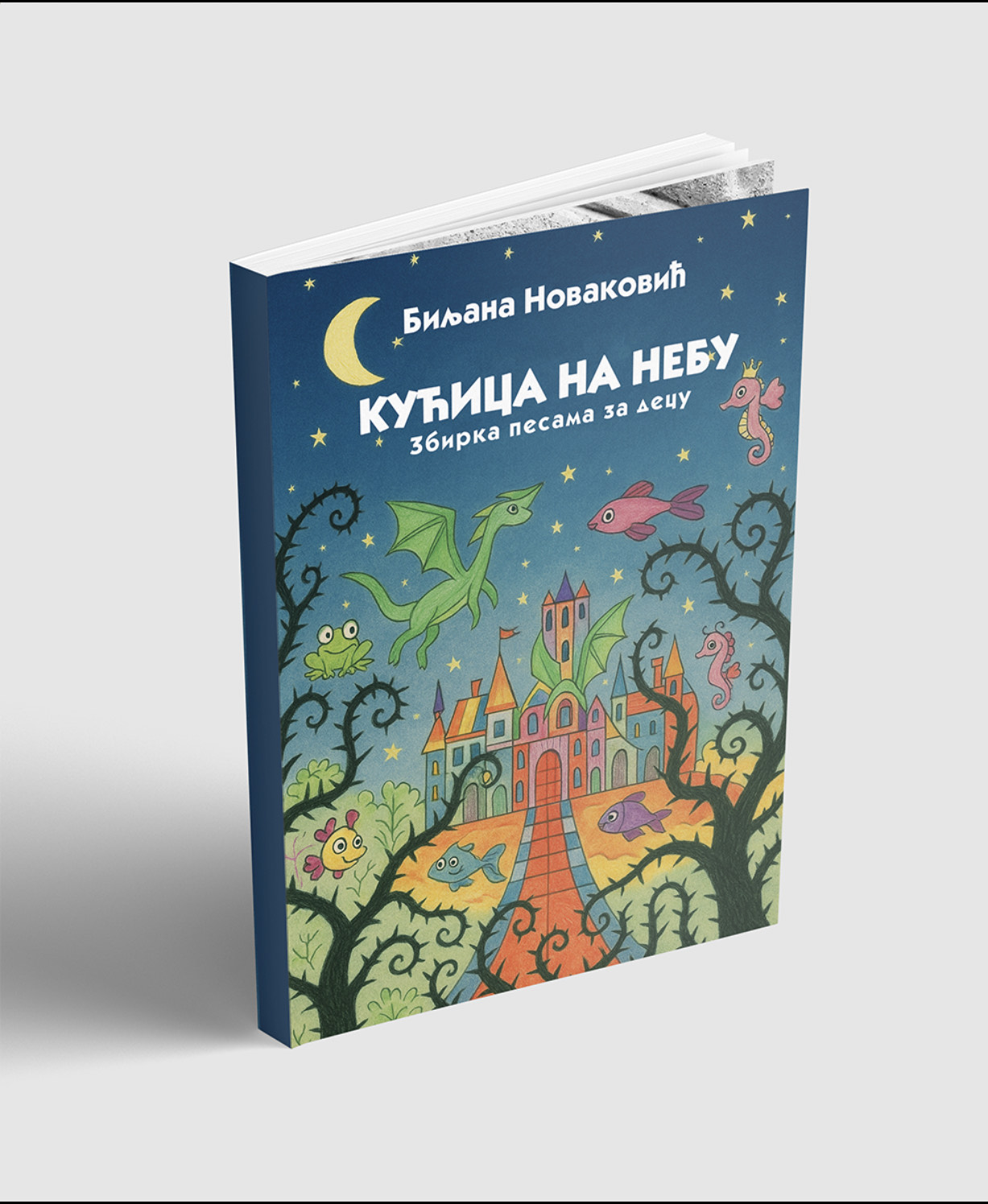 Збирка песама Кућица на небу настала je спонтано, како ауторка каже ни сама није веровала да може да настави тамо где је стала. У детињству је писала писма Богу у виду дневника, а данас наставља да пише душом осврћући се на девојчицу изнутра. Ова збирка је занимљива на свој начин јер промовише дечије стваралаштво, поред поезије до изражаја долазе и ликовни радови деце која на свој начин осликавају живот. У жељи да поново завири у дечији свет она успева да обоји своје детињство са пуно боја. Захвална на прилици да искаже стварање, на путу добија учитеље, менторе Арт радионица и уређивачки тим издавача са којима долази до реализације идеје. Са нестрпљењем чека да се окупи са свима који су учествовали и који ће читати ову необичну збирку. Унутра је открила неколико прича за децу које су јој посебно драге, о рођендану, радовању, помагању….